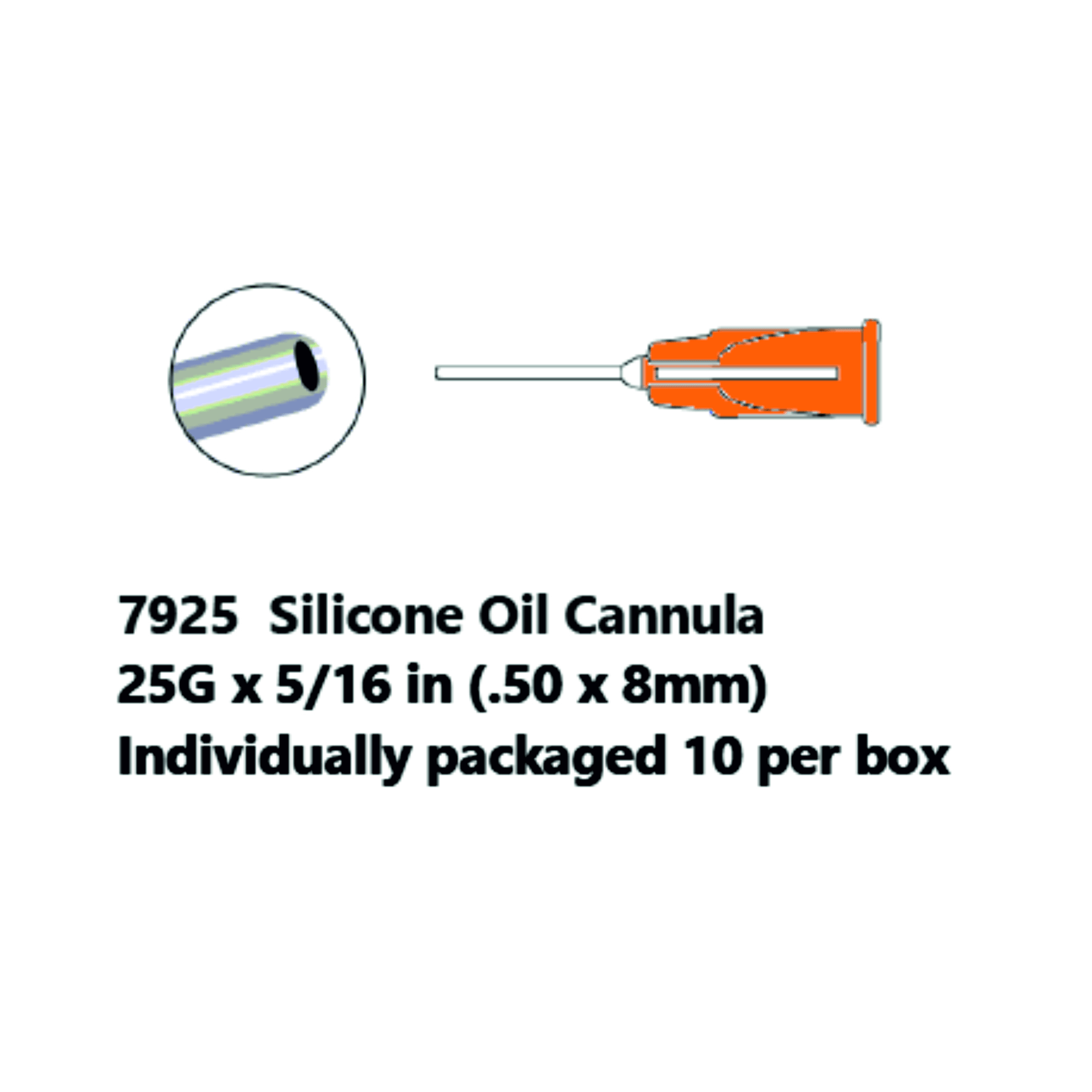 Cánula recta y corta de 25G con el extremo redondeado y orificio frontal. Sistema de conexión luer-lock. De un solo uso.