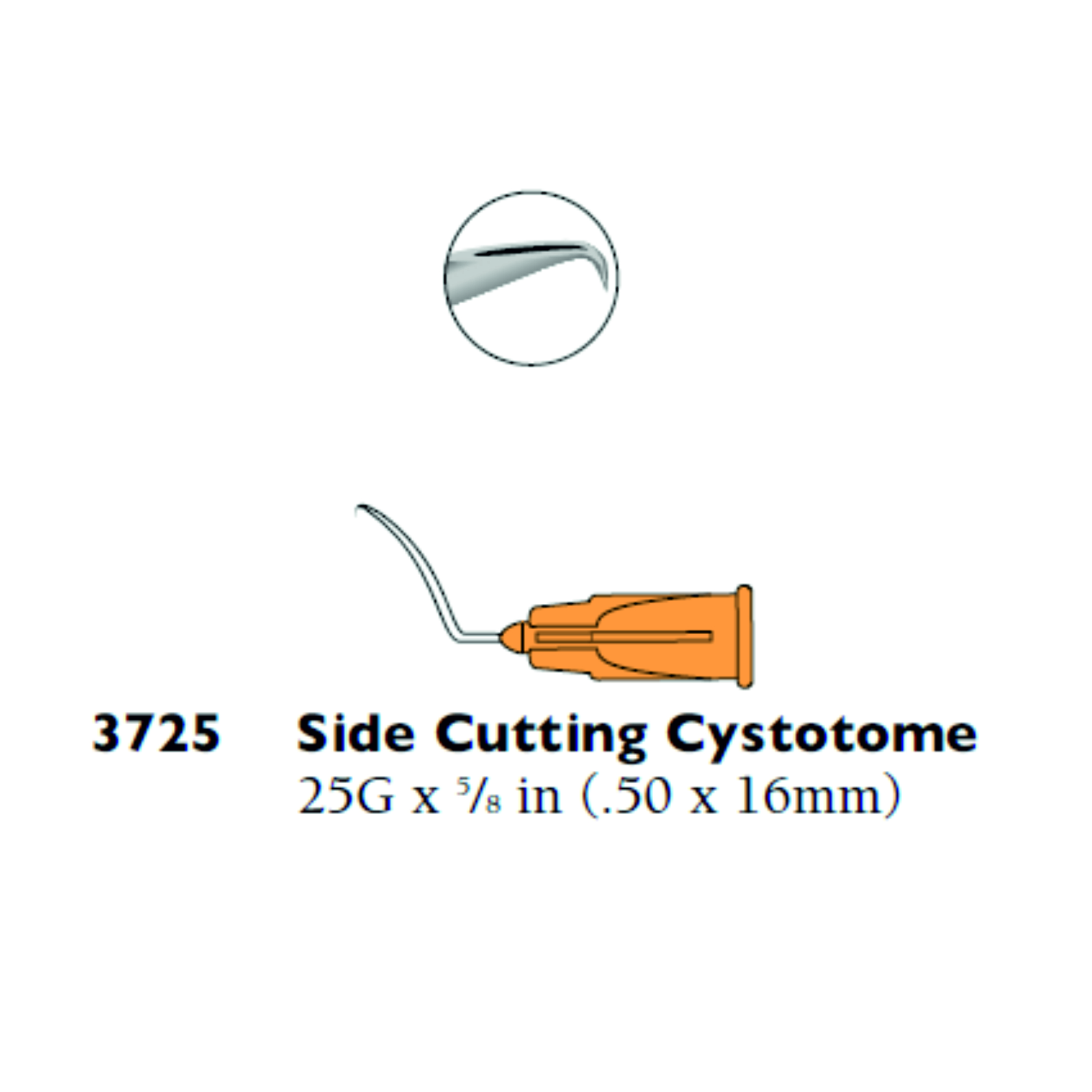 Cánula angulada con el tramo distal acodado de 25G. Punta afilada con bordes cortantes, doblada 90° hacia el exterior del lumen. Sistema de conexión Luer-lock. De un solo uso.