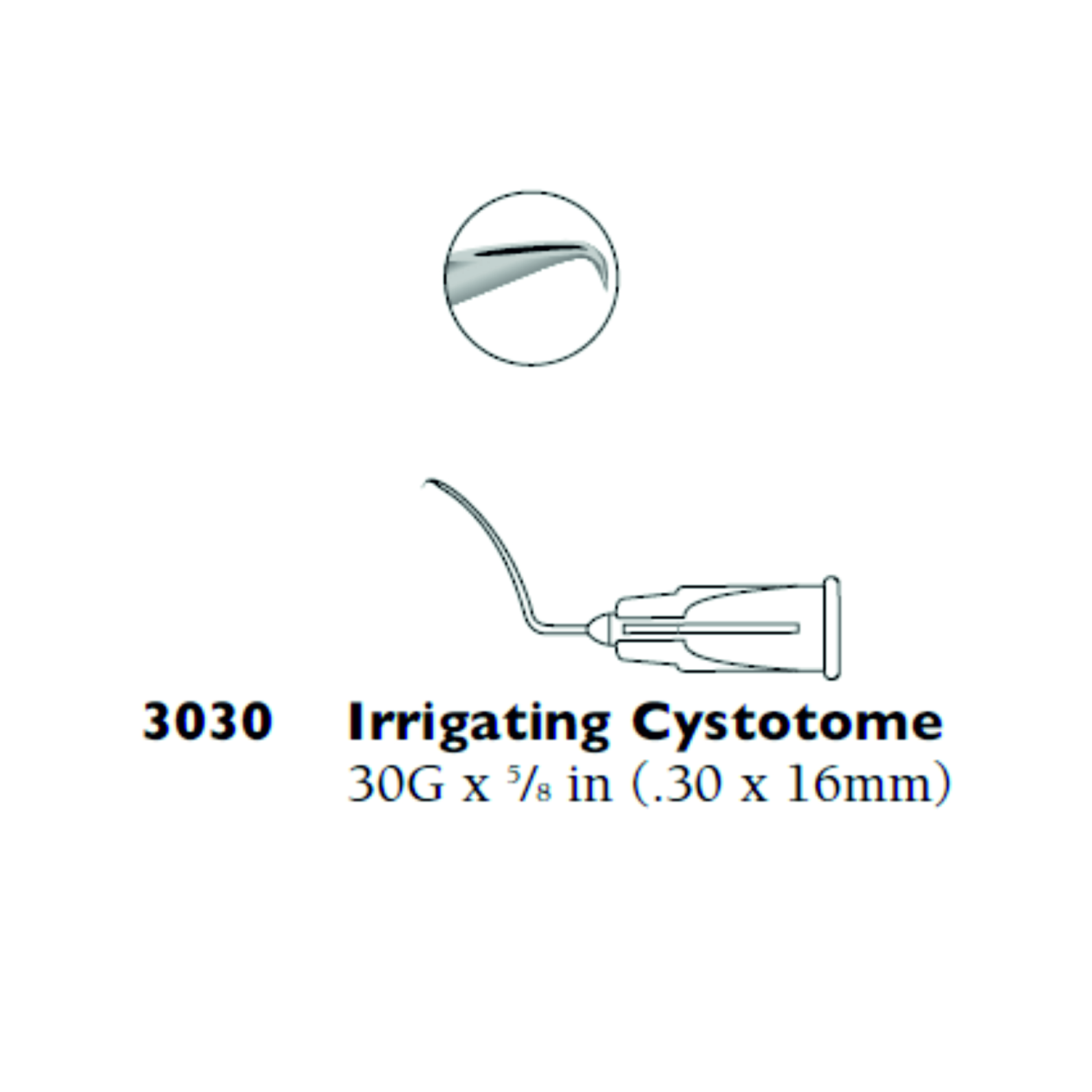 Cánula angulada con el tramo distal acodado de 30G Punta afilada y doblada 90° hacia el exterior del lumen. Sistema de conexión Luer-lock. De un solo uso.