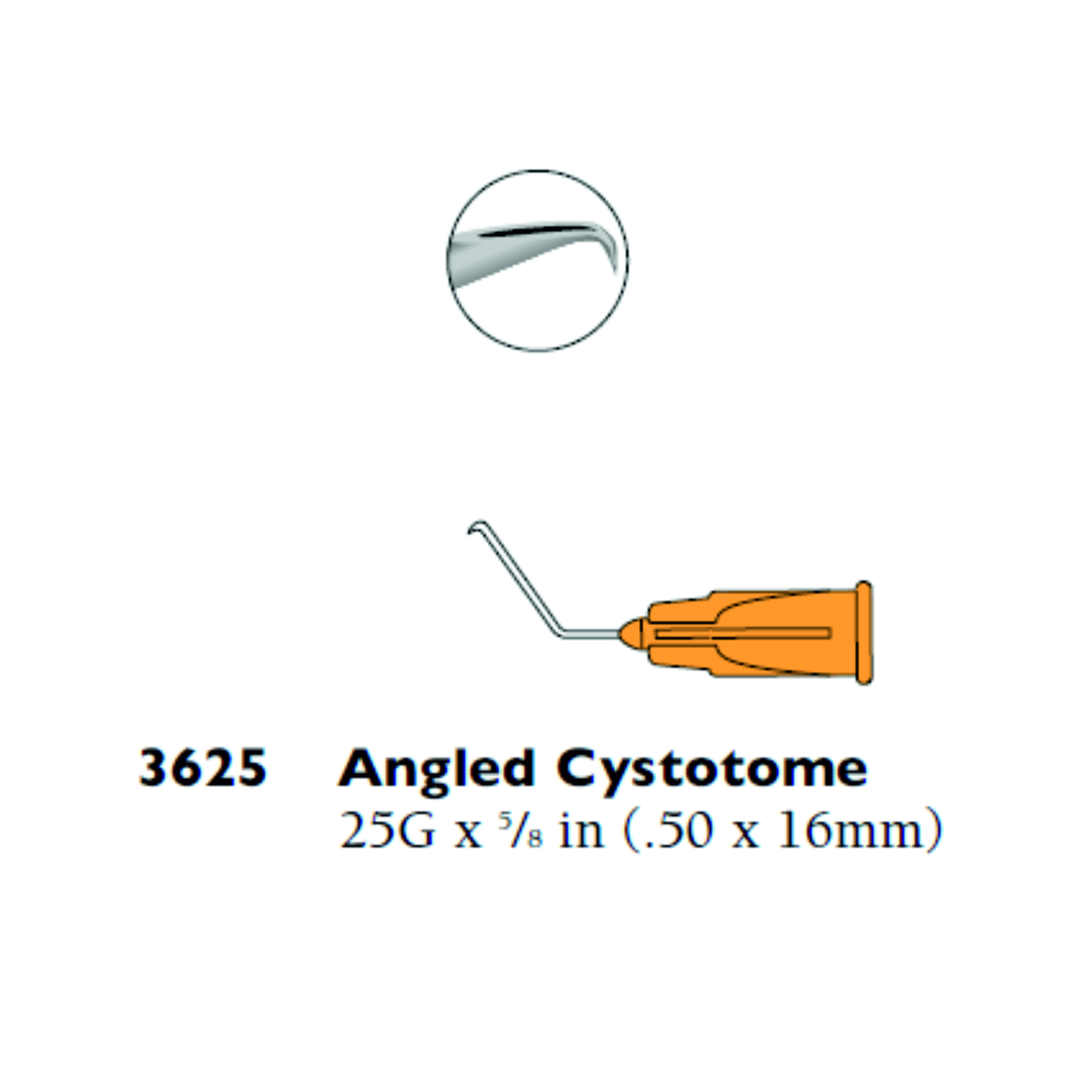 Cánula angulada de 25G con el tramo distal más corto, ligeramente acodado y con el extremo curvado. Punta doblada y torcida 90º hacia el exterior del lumen. Sistema de conexión Luer-lock. De un solo uso.