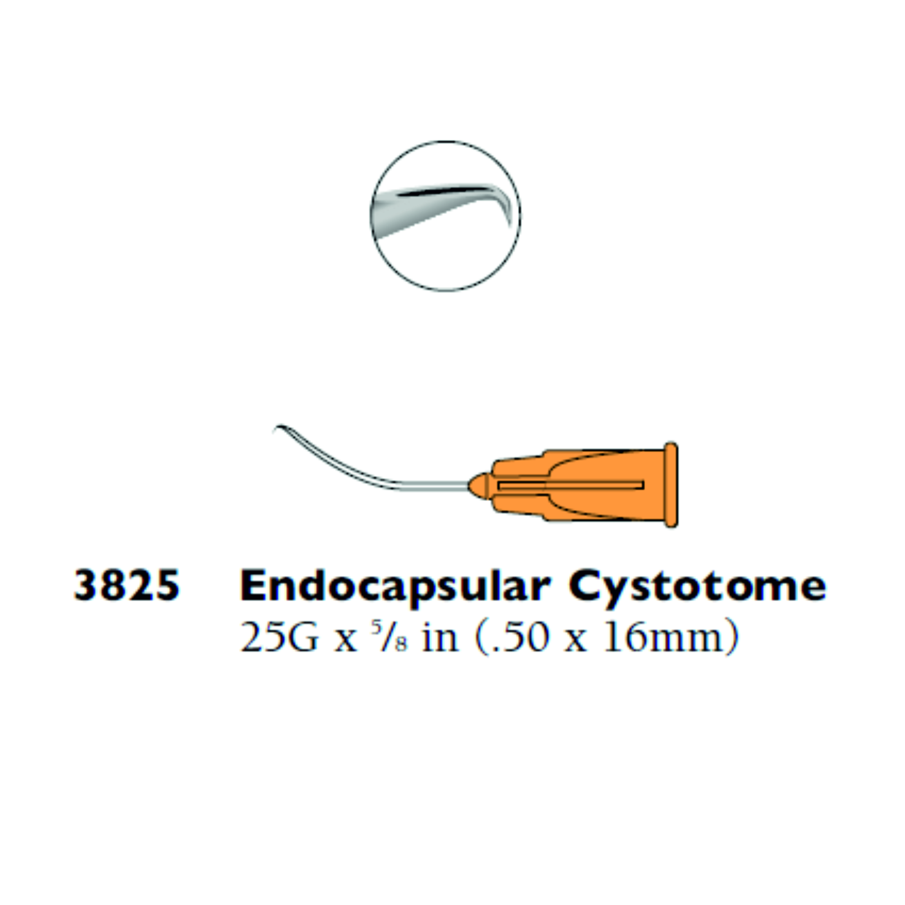 Cánula curvada de 25G. Punta afilada y doblada 90° hacia el exterior del lumen. Sistema de conexión Luer-lock. De un solo uso.