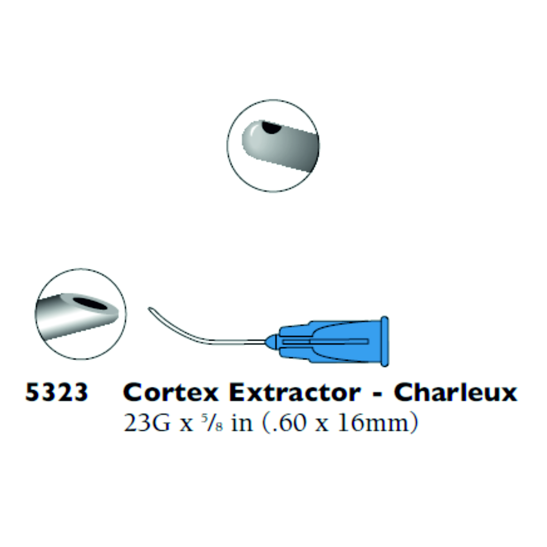 Cánula curvada de 23G con punta biselada y puerto frontal. Sistema de conexión Luer-lock. De un solo uso.