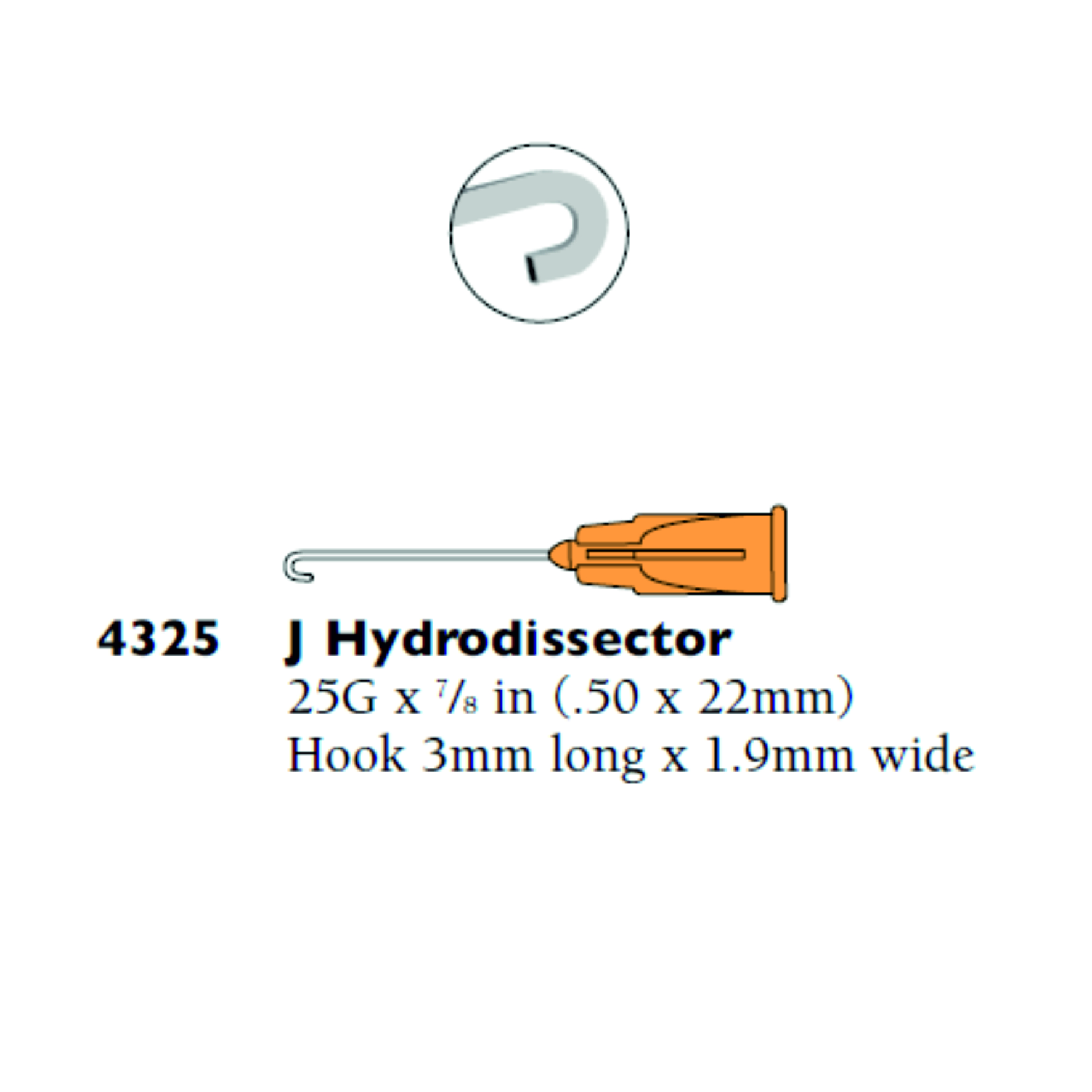 Cánula recta de 25G con el extremo doblado en forma de gancho. Punta roma redondeada y suave. Sistema de conexión Luer-lock. De un solo uso.