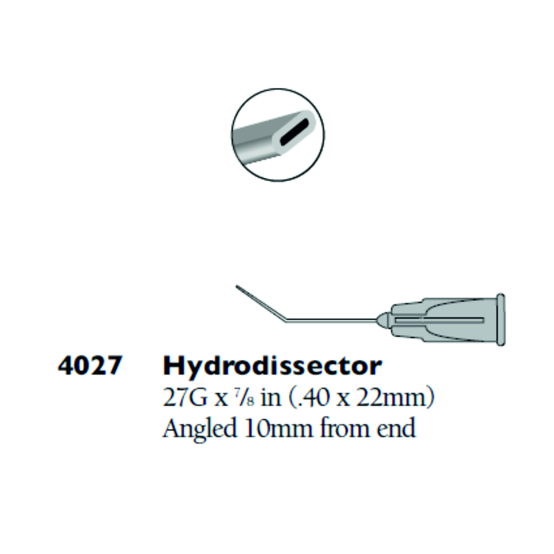 Diámetro = 0.40mm. Longitud total = 22mm. Longitud desde angulación = 10mm.