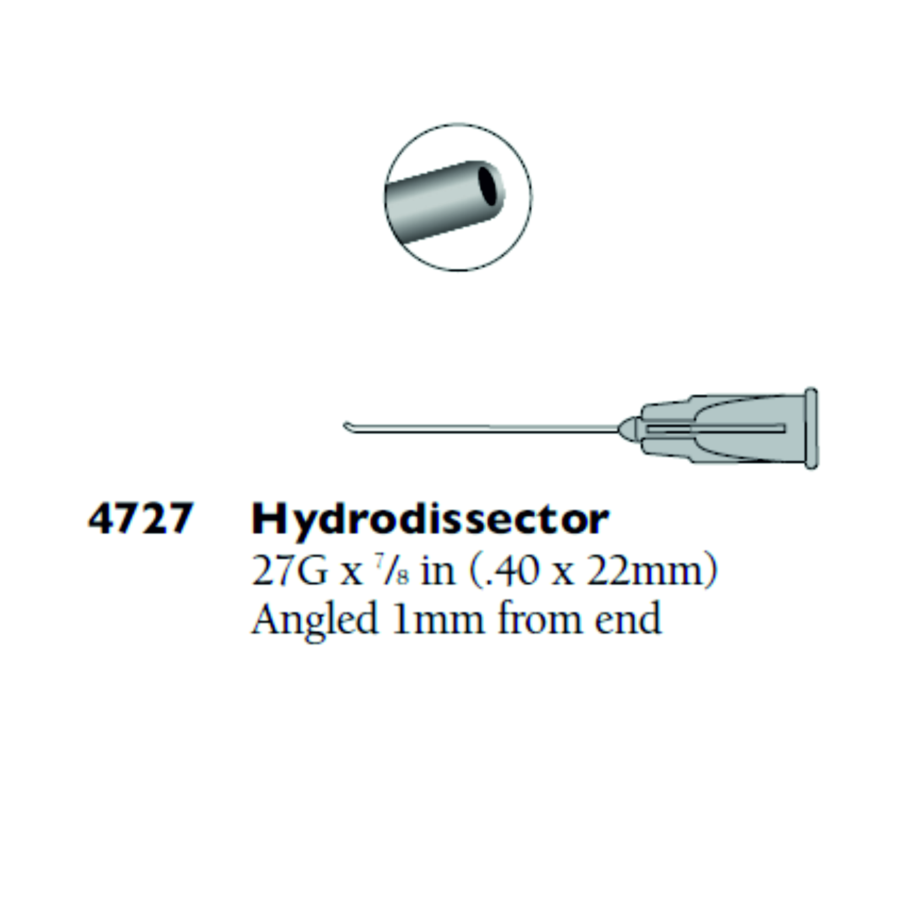 Cánula angulada en su extremo de 27G. Punta roma redondeada y suave. Sistema de conexión Luer-lock. De un solo uso.