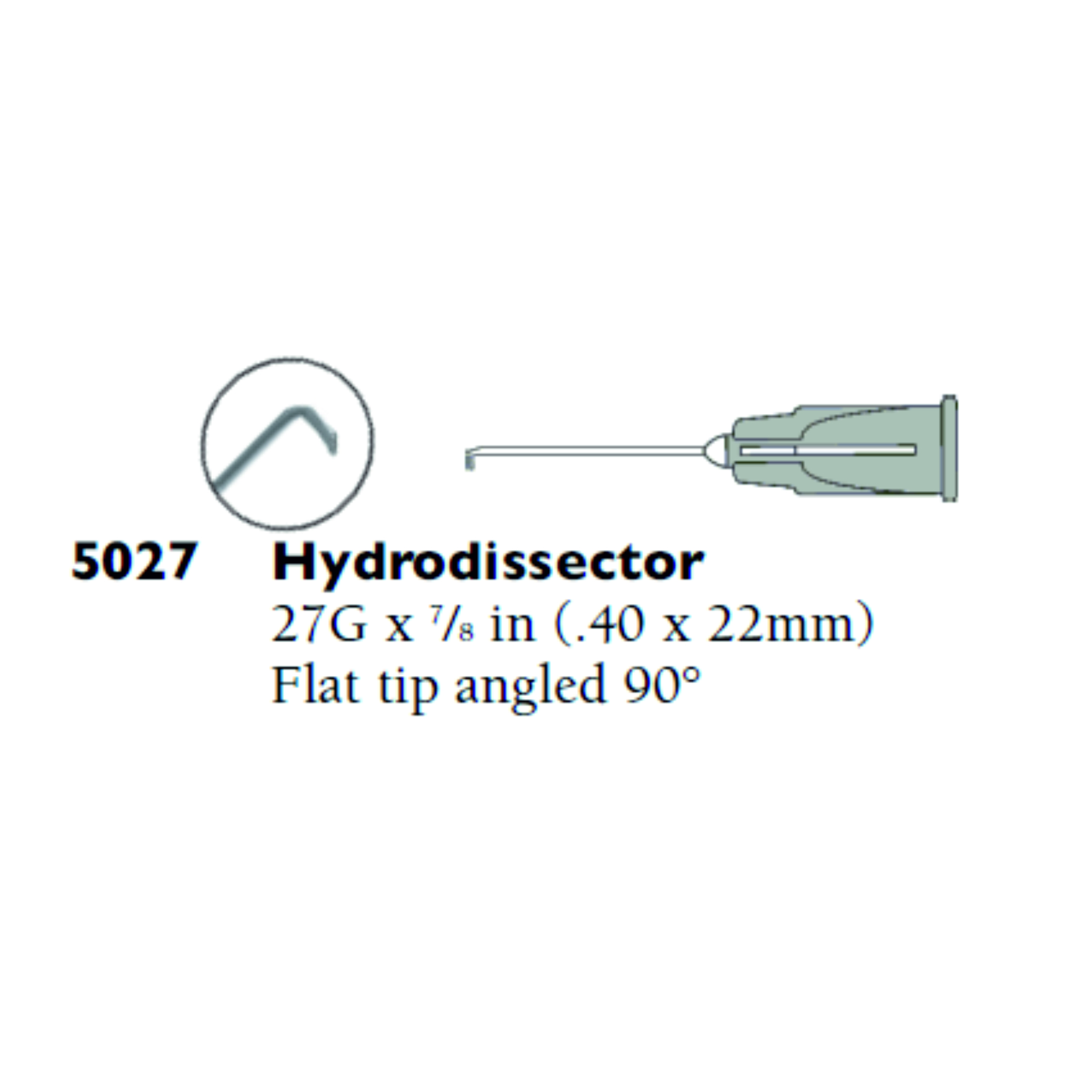 Cánula recta de 27G con el extremo angulado 90°. Punta plana en horizontal. Sistema de conexión Luer-lock. De un solo uso.