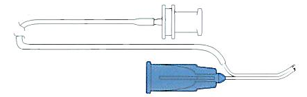 Cánula de irrigación y aspiración de boble cuerpo de 23G/23G, una cánula conectada al tubo flexible con puerto lateral para la aspiración y la otra con puerto frontal para la irrigación. De un solo uso.
