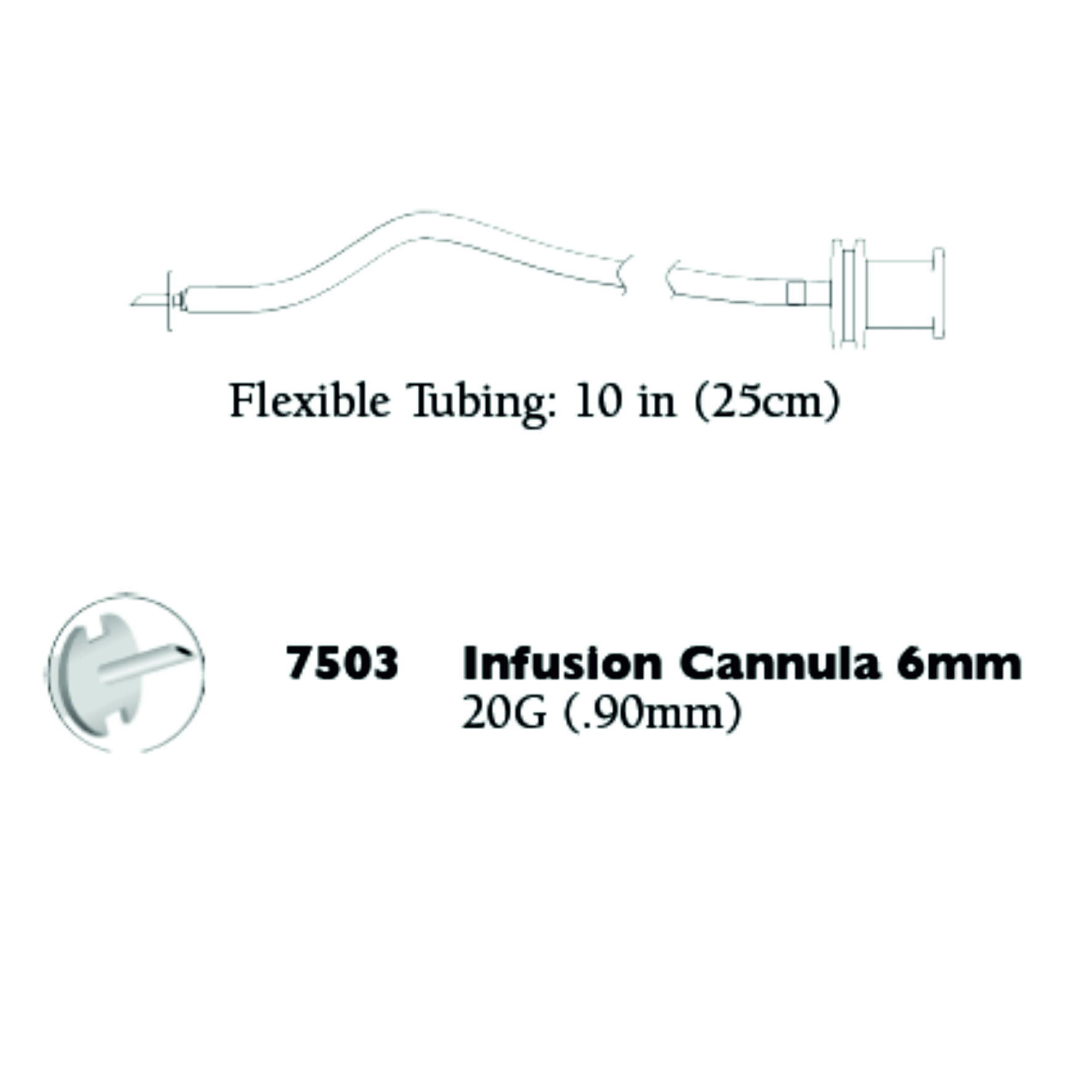 Cánula recta de 20G de tamaño grande con punta biselada y conectada a un tubo flexible con conector universal. De un solo uso