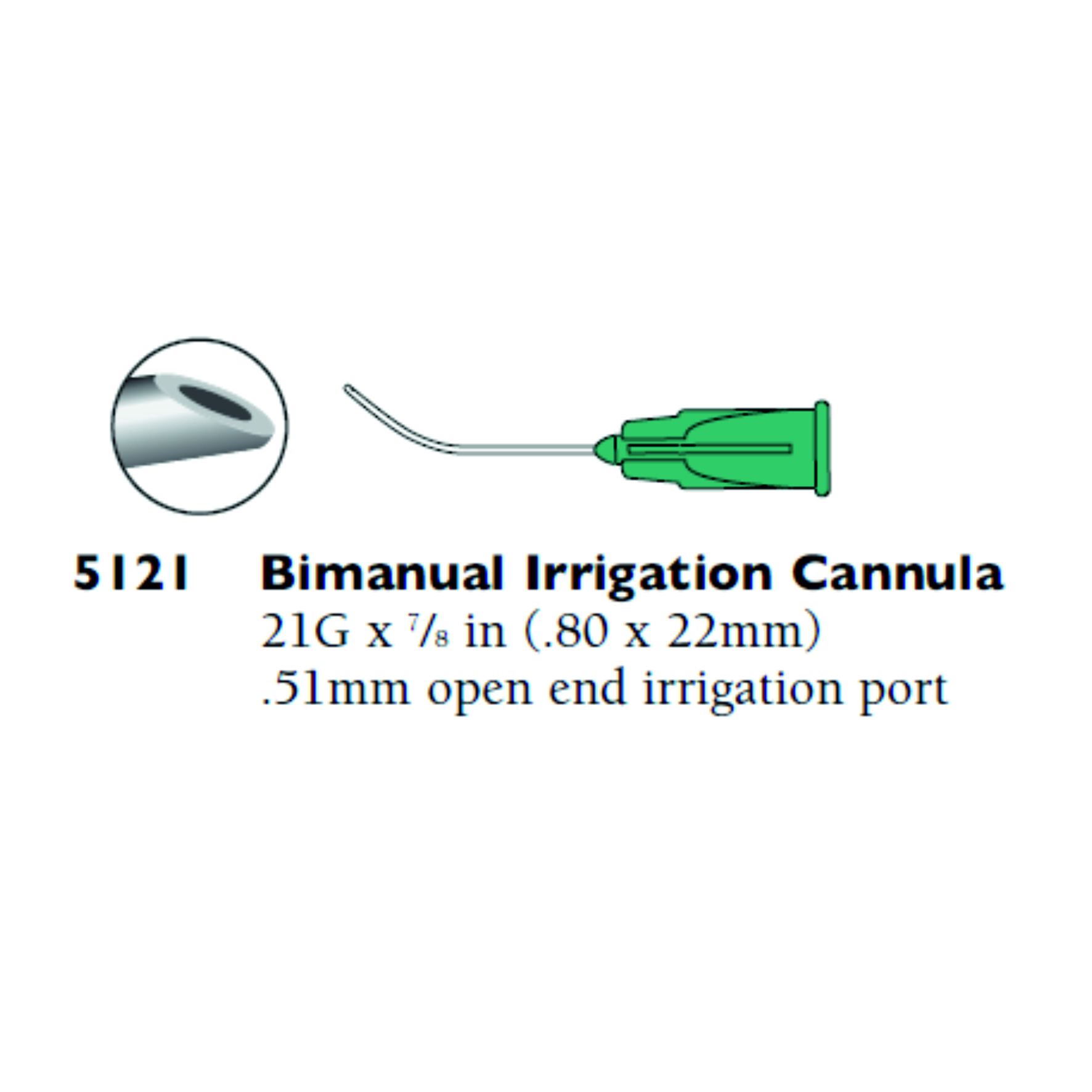 Cánula curvada de 21G con punta biselada y puerto de irrigación frontal. Sistema de conexión Luer-lock. De un solo uso.
