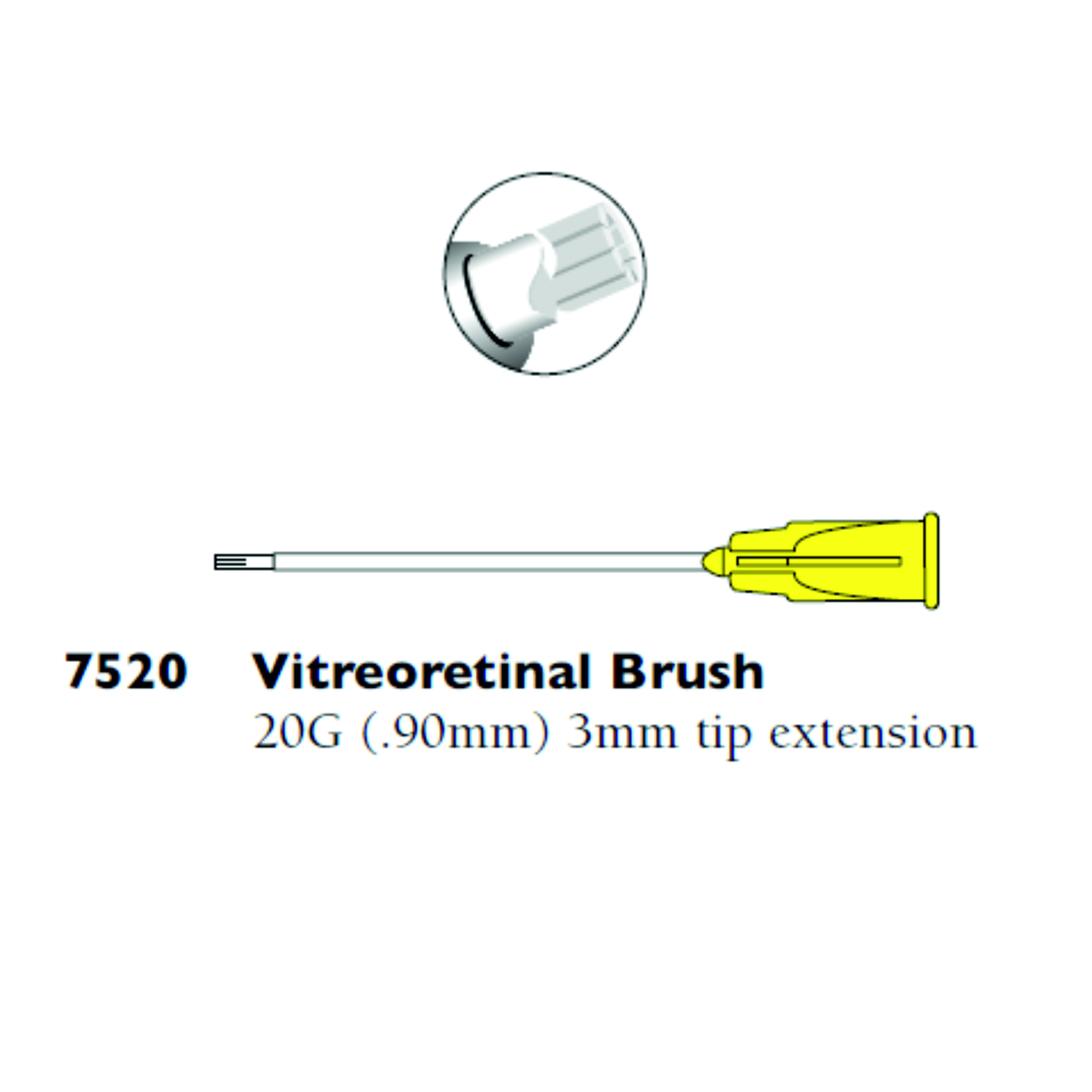 Cánula recta de 20G con punta suave y flexible en el extremo a modo de cepillo. Sistema de conexión luer-lock. De un solo uso.