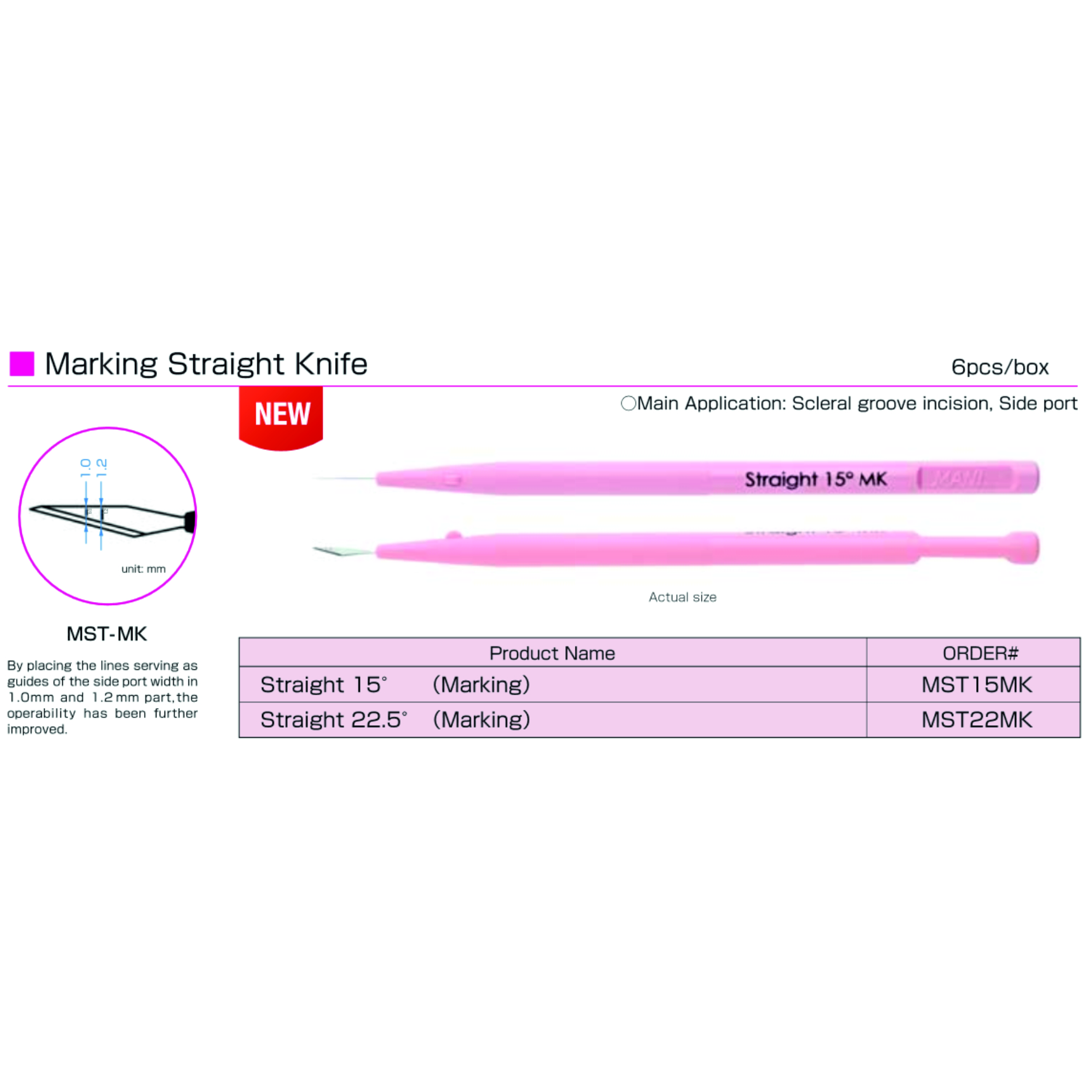 Cuchillete oftálmico recto con hoja con punta en ángulo y borde inferior cortante. Con marcas de referencia que permiten controlar la anchura de la incisión de 1.0mm y 1.2mm. Con su material de acero austentite y su fabricación por moldeado en frío, se obtiene mayor resistencia a la rotura y una alta repetibilidad de calidad, disminuyendo el índice de unidades defectuosas. De un solo uso