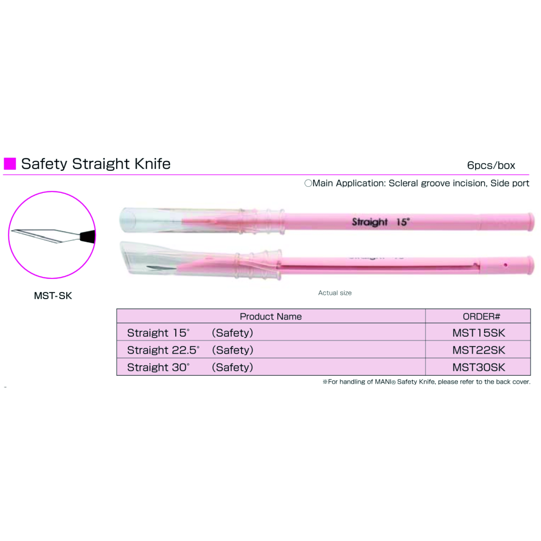 Cuchillete oftálmico recto con hoja con punta en ángulo y borde inferior cortante, con sistema de seguridad. Con su material de acero austentite y su fabricación por moldeado en frío, se obtiene mayor resistencia a la rotura y una alta repetibilidad de calidad, disminuyendo el índice de unidades defectuosas. Tratamiento antirreflejante en la cara superior. De un solo uso.