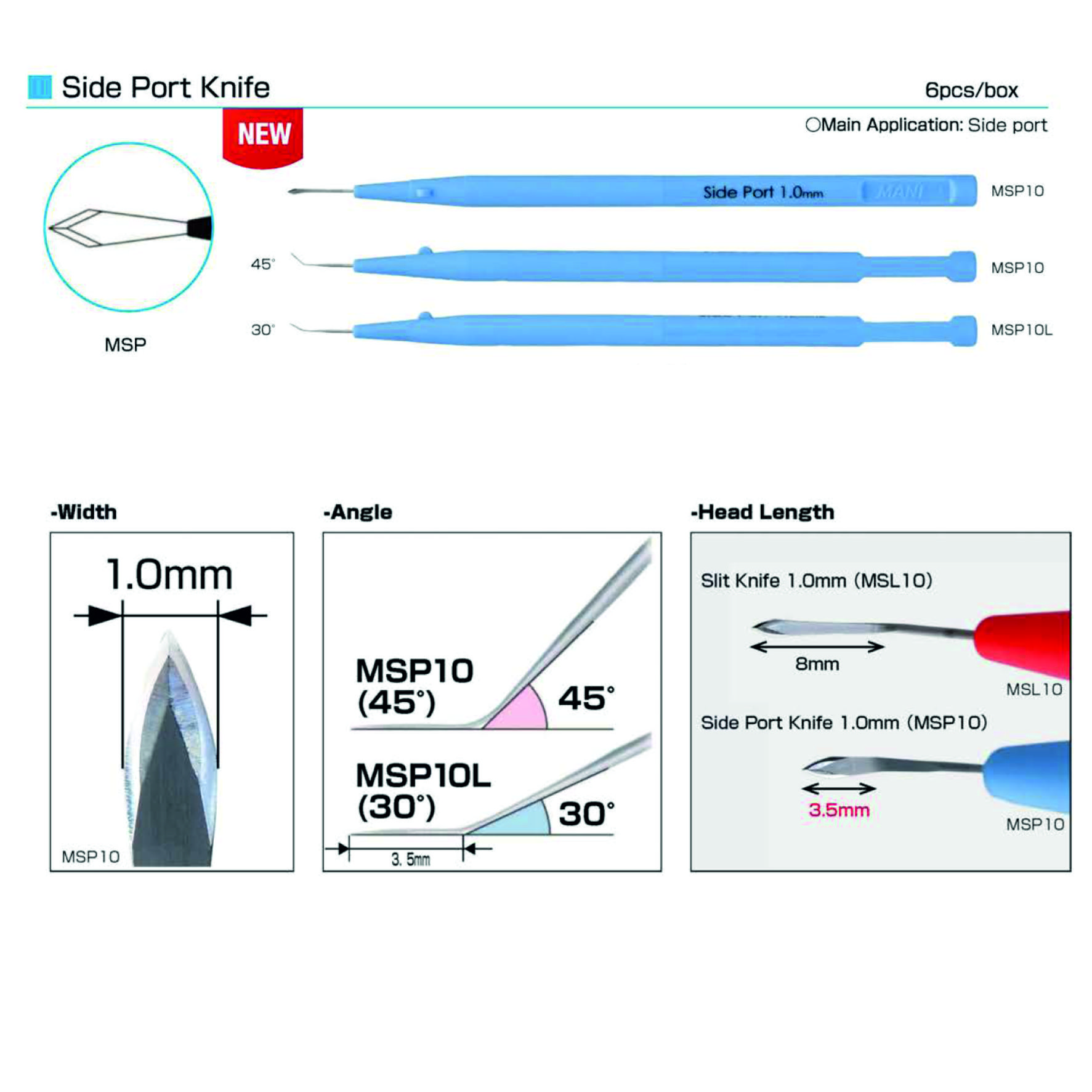 Cuchillete oftálmico angulado con hoja triangular más corta, para un mayor control, y bordes cortantes. El diseño del afilado de la hoja, se caracterizan por tener mayor bisel en la cara superior y menor en la inferior, facilitando mantenerse en el plano recto. Aporta mayor control, precisión y seguridad al cirujano. Con su material de acero austentite y su fabricación por moldeado en frío, se obtiene mayor resistencia a la rotura y una alta repetibilidad de calidad, disminuyendo el índice de unidades defectuosas. Tratamiento antirreflejante en la cara superior. De un solo uso.